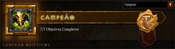 CORREDOR – Completar os Atos de 1 ao 5 no nível máximo em menos de UMA hora.SPEED RACER – Completar os Atos de 1 ao 5 no nível máximo em menos de UMA hora no Hardcore.AVARENTO – Coletar 50.000.000 de Ouro fora da Câmara do Tesouro e no Santuário Interno.AVARÍCIA – Coletar 50.000.000 de Ouro fora da Câmara do Tesouro e no Santuário Interno no Hardcore.QUE ONDA – Alcançar a Feda Maior de Nível 45 Solo sem nenhum item de Conjunto equipado.SOBRE-HUMANO – Alcançar a Feda Maior de Nível 45 Solo sem nenhum item de Conjunto equipado no Hardcore.ANOS DE GUERRA – Alcançar a Fenda Maior nível 55 com os bônus de seis conjuntos de classe.DINASTIA – Alcançar a Fenda Maior nível 55 com os bônus de seis conjuntos de classe no Hardcore.MESTRE DO UNIVERSO – Dominar 8 Masmorras de Conjunto.MESTRE DOS CONJUNTOS – Dominar 8 Masmorras de Conjunto no Hardcore.